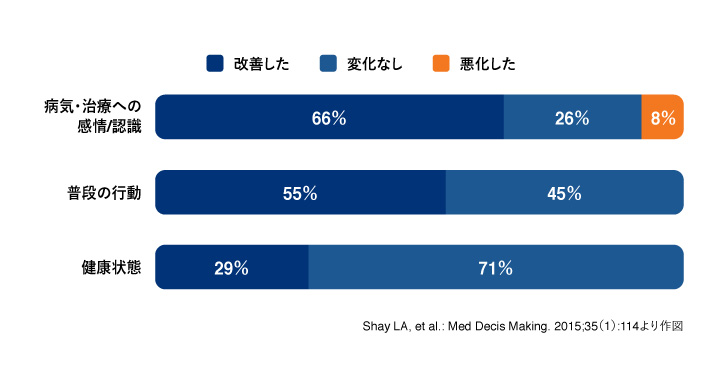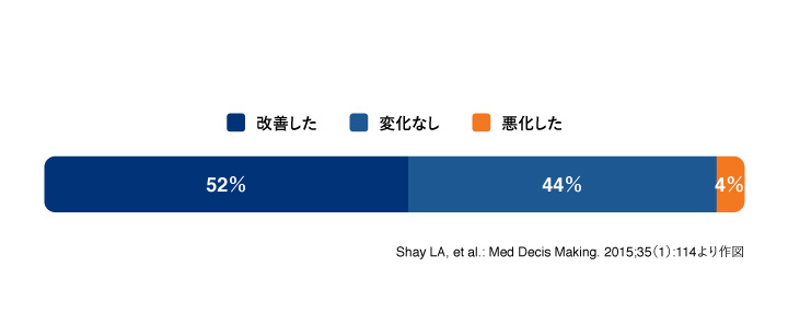 SDMによって治療に良い影響があることは、SDMによる治療の効果について、「患者さん」、「治療の観察者」、または「医師と患者さんの共同」で評価した結果をまとめた研究でわかりました1)。SDMによって治療効果が「改善した」という評価の割合は43%だったのに対して、「悪化した」という評価の割合は3%でした。さらに患者さんによる評価だけを調べると、「改善した」は52%で、より高い割合になりました。